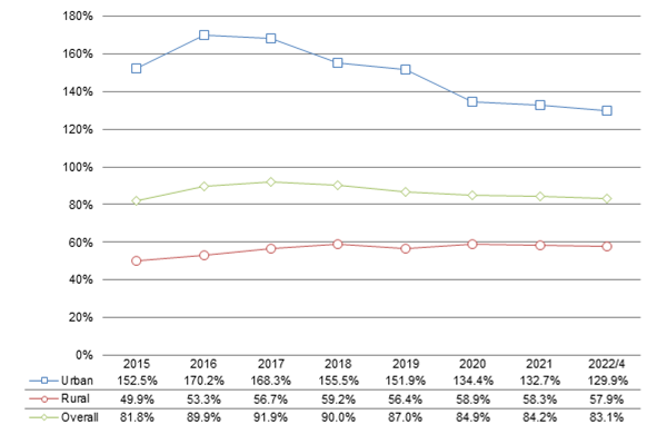 For urban-rural differences, India's urban tele-density plateaued in 2016 (170.2%) and 2017 (168.3%) but had come down to 151.9% in 2019, below the 2015 level of 152.5%. The reason why the country's overall tele-density could hold above the 2015 level as of April 2022 was that the rural tele-density was able to maintain steady at 58% from 2020 onwards.