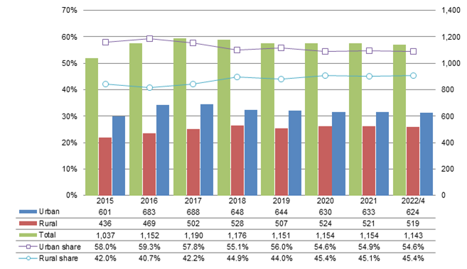 Chart 2: India telecom services user number in urban and rural areas, 2015-April 2022 (m unit)