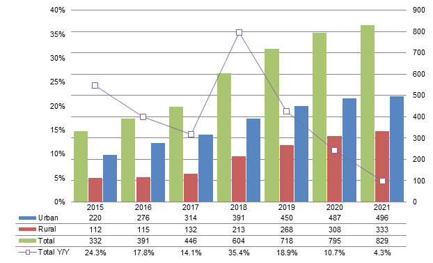 India's urban Internet user base grew at a slower pace from 487 million in 2020 to 496 million in 2021. Its rural Internet user base increased from 308 million to 333 million during the same period and the proportion among its rural telecom user base was only about 64%, meaning there is plenty of room for growth.