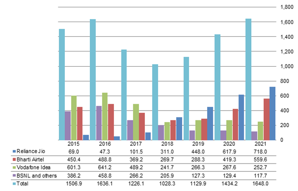 Indian people are highly dependent on wireless communication for Internet access. Indian telecom operators' access service revenue reached a new peak in 2021 since 2015 mainly as they had come to realize the need to moderately raise their ARPU and succeeded at doing so by driving users to upgrade to 4G services starting 2020.