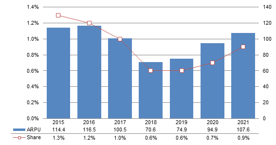 Indian telecom operators' monthly ARPU came to INR70.6 in 2018, which was also a low point, and then continued to rebound to INR107.6 in 2021, still short of the peak of INR116.5 seen in 2016. Nevertheless, the 1.154 billion telecom user base in 2021, exceeding the 1.152 billion telecom user base in 2016, drove Indian telecom operators' total access service revenue to a new high.