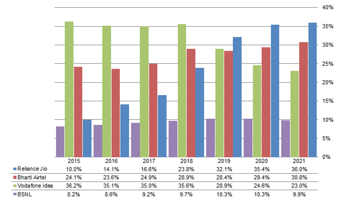 Chart 6: India telecom carriers share of local telecom services users, 2015-April 2022