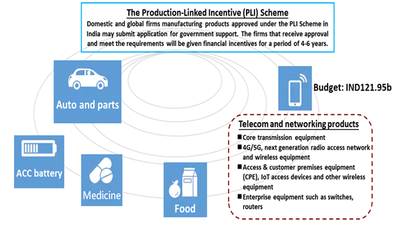 The India government announced the PLI Scheme for Telecom and Networking Products in February 2021, intending to build a strong 5G ecosystem. The PLI Scheme allocated an INR121.95 billion budget to support local manufacturing of telecom and networking products by domestic and global manufacturers. Eligible manufacturers will receive incentives for five years.