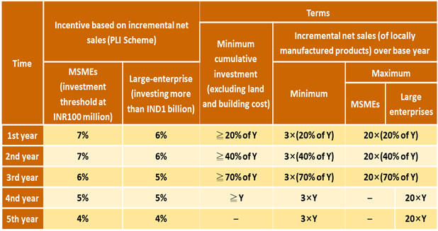 India's financial year runs from 1 April to 31 March the following year. If firms apply for incentives under the PLI Scheme with 2022 as the first year, the base year is 2021. The Scheme stipulates that the incremental net sales of goods manufactured locally by MSMEs and non-MSMEs must be at least three times the required cumulative investment for the year. The maximum eligible incremental net sales are 20 times the required cumulative investment for the year for first three years and there is no maximum for MSMEs for the fourth and fifth years.
